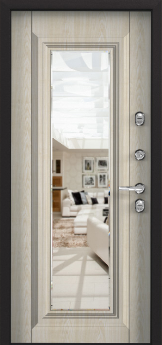 Конструкция двери включает каркас из профильной трубы 50х25 мм и лист металла толщиной 2 мм, что делает её прочной и надежной. Шумоизоляция, выполненная с использованием минваты или пенопласта, эффективно снижает уровень шума, обеспечивая тишину и спокойствие. Два контура резинового уплотнителя улучшают герметичность, а терморазрыв коробки и полотна помогает поддерживать стабильную температуру внутри помещения. Дополнительный декор в виде зеркала придаёт двери элегантности, а возможность замены замков на более современные модели, включая умные замки, делает её еще более универсальной и безопасной.